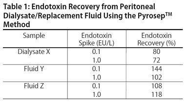 Las muestras fueron preparadas usando líquido de diálisis comercial (dializado X) y dos tipos de fluidos de sustitución para riñones artificiales (fluidos Y y Z), con cantidades de 5.0 mL en cada caso. A cada uno se le adicionó Endotoxina Estándar de Referencia USP y se ajustó el pH a aprox.5 con ácido acético. La concentración de endotoxina en cada muestra fue medida usando el método Pyrosep™ y la endotoxina añadida fue recuperada. Con el uso del método Pyrosep™, la endotoxina en líquido de diálisis puede ser detectada desde un rango de 0.1 EU/L.