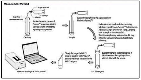 La endotoxina de la muestra es adsorbida en una columna capilar empaquetada con Pyrosep™ (un adsorbente de afinidad, con histidina enlazada a un soporte insoluble en agua mediante un espaciador, diseñado específicamente para adsorber endotoxina). El resto de las sustancias contenidas en la muestra pueden ser lavadas; permitiendo que la endotoxina adsorbida active el reactivo de LAL para su cuantificación, pudiéndose realizar la medida en un Toxinometer®.