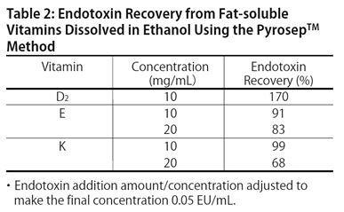 A las vitaminas liposolubles D, E y K disueltas en etanol, se les añadió Endotoxina Estándar de Referencia USP. Las concentraciones de endotoxina en las muestras se midieron usando el método Pyrosep™ y la endotoxina añadida fue recuperada de cada muestra. El uso del método Pyrosep™ permite la detección de endotoxinas en vitaminas liposolubles, las cuales no pueden ser medidas con reactivos de Limulus.
