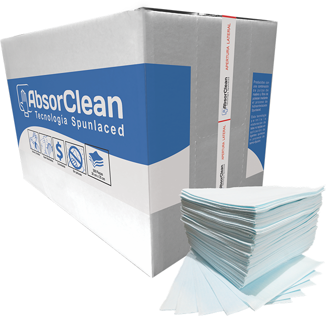Los paños de limpieza ABSORCLEAN son producidos con una combinación de pulpa de madera y fibra de poliéster mediante el proceso de hidroentrelazado Spunlaced.